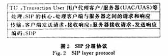 SIP本身是一種分層協(xié)議,如圖2所示。由此可見(jiàn),SIP采用C/S結(jié)構(gòu),通過(guò)MESSAGE機(jī)制來(lái)建立會(huì)話。因?yàn)镾IP處理的是客戶端與服務(wù)器之間的請(qǐng)求和響應(yīng),所以SIP消息包括了請(qǐng)求消息和響應(yīng)消息。二者都具有相同的消息格式: