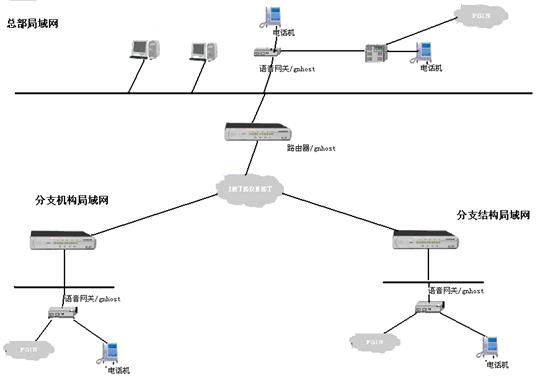 首先將VOIP電話網(wǎng)關(guān)的網(wǎng)絡(luò)接口接入到公司和分部(分公司)的局域網(wǎng)中,通過(guò)ADSL、ISDN、撥號(hào)上網(wǎng)等方式,同連接在此因特網(wǎng)上的其它VOIP電話網(wǎng)關(guān)相連,從而將不同地域的電話連接在一起,組成整個(gè)公司的IP電話網(wǎng),如果總部或分部有用戶程控交換機(jī),還可以將VOIP電話網(wǎng)關(guān)接入程控交換機(jī),使得整個(gè)交換機(jī)的分機(jī)都能利用IP網(wǎng)絡(luò)撥打免費(fèi)電話。如果這個(gè)VOIP設(shè)備具有PBX的功能。那么電話網(wǎng)關(guān)的多種接口還可以與電信(PSTN)相連,從而將專網(wǎng)的IP電話語(yǔ)音網(wǎng)與整個(gè)公網(wǎng)銜接成一個(gè)大的電話網(wǎng)絡(luò)。