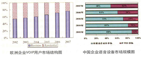 相關(guān)數(shù)據(jù)顯示,企業(yè)級(jí)VOIP的市場(chǎng)規(guī)模將以超過(guò)40%的年復(fù)合增長(zhǎng)率增長(zhǎng),2010年前仍將占據(jù)整個(gè)VOIP市場(chǎng)的50%以上。從“歐洲VOIP用戶市場(chǎng)結(jié)構(gòu)圖”來(lái)看,企業(yè)VOIP用戶的占比在逐年提升,2007年可達(dá)到70%左右。全球企業(yè)VOIP的設(shè)備銷(xiāo)售形勢(shì)也是一片大好,Juniper Research最新發(fā)表的研究報(bào)告稱,2007年企業(yè)VOIP設(shè)備市場(chǎng)的銷(xiāo)售收入將達(dá)到55億美元。