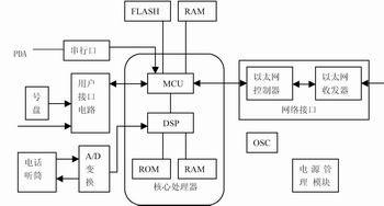 VoIP話機的構(gòu)造如圖3所示。其用戶接口部分與普通話機無異,顯示器用來顯示相關(guān)的信息,如發(fā)起呼叫時所撥的號碼、來電顯示等。此外,VoIP話機可以由串行口與個人數(shù)字助理(PDA)設(shè)備相連,實現(xiàn)軟件升級、自動撥號等功能。話音接口的功能是實現(xiàn)話音模擬信號與標(biāo)準(zhǔn)64Kbit/s