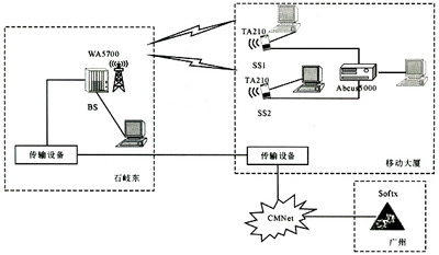 組網(wǎng)時,由于BS(石岐東)需要與廣州的SoftX連接,因此,實際組網(wǎng)方案通過傳輸設(shè)備連接公安局與移動大廈;然后通過移動大廈的CMNet網(wǎng)絡(luò)連接廣州的SoftX。在該個組網(wǎng)中,視距傳播環(huán)境通過固定在移動大樓支架上的遠端站實現(xiàn),非視距傳播環(huán)境通過移動的遠端站實現(xiàn)。