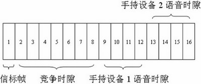 根據(jù)設(shè)計(jì)的特點(diǎn),無線語音網(wǎng)關(guān)同手持設(shè)備間的無線網(wǎng)絡(luò)采用星型拓?fù)浣Y(jié)構(gòu),無線語音網(wǎng)關(guān)作為無線個(gè)域網(wǎng)的協(xié)調(diào)器同手持設(shè)備進(jìn)行信息交互。IEEE802.15.4MAC層分為使用信標(biāo)幀和不使用信標(biāo)幀兩種工作模式,本設(shè)計(jì)采用使用信標(biāo)幀同步的超幀結(jié)構(gòu),由無線語音網(wǎng)關(guān)發(fā)送信標(biāo)幀同步無線手持設(shè)備的數(shù)據(jù)傳輸。本設(shè)計(jì)中超幀長30ms,等分為16個(gè)時(shí)隙,每個(gè)時(shí)隙為1.875ms。信標(biāo)幀在時(shí)隙1發(fā)送,時(shí)隙2到時(shí)隙8為競(jìng)爭(zhēng)時(shí)隙,使用時(shí)隙CSMA-CA算法傳輸命令幀和應(yīng)答幀。時(shí)隙9到時(shí)隙16固定分配給兩個(gè)手持設(shè)備作為上下行語音數(shù)據(jù)通道。上下行各兩個(gè)時(shí)隙的分配可以滿足經(jīng)