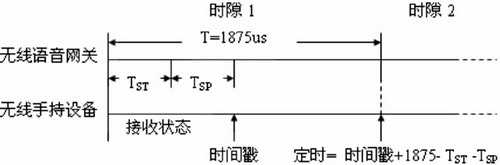由于所有信息傳輸都是在雙方約定的時(shí)隙內(nèi)進(jìn)行,時(shí)隙的錯(cuò)位,抖動(dòng)都將造成丟幀,而丟幀對(duì)語音質(zhì)量的影響非常大,所以本設(shè)計(jì)的一個(gè)關(guān)鍵點(diǎn)是實(shí)現(xiàn)語音網(wǎng)關(guān)與手持設(shè)備間的精確同步,即手持設(shè)備在收到信標(biāo)幀后保證隨后15個(gè)時(shí)隙與語音網(wǎng)關(guān)的對(duì)應(yīng)時(shí)隙對(duì)齊。本設(shè)計(jì)利用了射頻芯片MC13192的接收時(shí)間戳功能來實(shí)現(xiàn)精確同步,如圖4所示。
