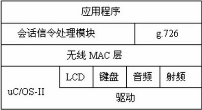 操作系統(tǒng)之上是無線MAC層,該模塊針對(duì)語音無線傳輸?shù)奶攸c(diǎn)簡化實(shí)現(xiàn)了IEEE 802.15.4 協(xié)議MAC層功能。第三層為語音壓縮編解碼g.726模塊和無線網(wǎng)內(nèi)部會(huì)話信令處理模塊。會(huì)話信令處理模塊負(fù)責(zé)處理來自無線語音網(wǎng)關(guān)的會(huì)話信令。最上層為應(yīng)用層,實(shí)現(xiàn)用戶界面和通話過程控制。無線手持設(shè)備總統(tǒng)框架如圖6所示。