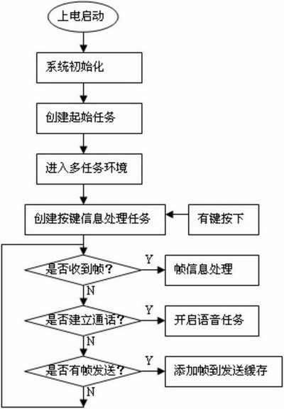 當(dāng)手持設(shè)備上電啟動(dòng)后,其工作流程如圖7示。首先進(jìn)行的是系統(tǒng)的初始化,包括處理器初始化,操作系統(tǒng)mC/OS-II初始化,LCD,鍵盤,射頻模塊等的初始化。之后建立起始任務(wù)并通過OSStart()函數(shù)進(jìn)入多任務(wù)環(huán)境。此時(shí)起始任務(wù)占用CPU資源,在起始任務(wù)中,建立按鍵信息處理任務(wù)并通過信號(hào)量機(jī)制掛起。然后判斷是否收到來自無線語音網(wǎng)關(guān)的幀,如果有,調(diào)用frame_deal()函數(shù)處理幀信息,在該函數(shù)中調(diào)用call_command_deal()完成無線網(wǎng)內(nèi)部會(huì)話信令的處理。接著判斷通話是否建立,如果建立則創(chuàng)建語音任務(wù),在語音進(jìn)程中使能PCM編解碼芯片,并進(jìn)行g(shù).726壓縮編碼。最后判斷是否有幀需要發(fā)送給無線語音網(wǎng)關(guān),如果有則把幀添加到發(fā)送緩存,等待發(fā)送時(shí)隙到來。這一過程完成以后重新跳到判斷是否收到來自無線語音網(wǎng)關(guān)的幀,重復(fù)以上過程。如果有鍵盤中斷,將會(huì)釋放一個(gè)信號(hào)量,該信號(hào)量將解掛按鍵信息處理任務(wù)。該任務(wù)對(duì)鍵盤輸入信息進(jìn)行處理。
