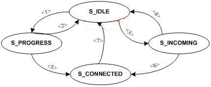 “S_IDLE”狀態(tài)就是我們通常所說的待機(jī)狀態(tài)。當(dāng)用戶撥打?qū)Ψ降腟IPURI,協(xié)議棧通過發(fā)送INVITE請(qǐng)求消息,得到臨時(shí)響應(yīng)消息,呼叫就處于“S_PROGRESS”,圖中箭頭<1>表示該操作引起的狀態(tài)切換。在“S_PROGRESS”狀態(tài),對(duì)方如果拒絕接受呼叫,狀態(tài)又返回“S_IDLE”,如箭頭<2>;當(dāng)對(duì)方接受呼叫,就處于連接通話狀態(tài)“S_CONNECTED”,如箭頭<5>。在“S_IDLE”狀態(tài)也可能收到對(duì)方的呼叫請(qǐng)求,當(dāng)UA應(yīng)用發(fā)現(xiàn)一個(gè)新的呼叫請(qǐng)求,就應(yīng)當(dāng)切換狀態(tài)到“S_INCOMING”,如箭頭<3>;同樣,用戶可以拒絕接受呼叫,狀態(tài)切換回“S_IDLE”,如箭頭<4>;當(dāng)用戶接受呼叫請(qǐng)求,呼叫狀態(tài)就處于“S_CONNECTED”。在“S_CONNECTED”狀態(tài),通話雙方任何一方的結(jié)束通話請(qǐng)求都會(huì)導(dǎo)致狀態(tài)返回“S_IDLE”,結(jié)束通話。