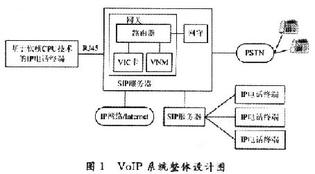 通過(guò)對(duì)國(guó)內(nèi)外VoIP技術(shù)的研究,要面向社會(huì)推廣價(jià)格低廉的IP電話業(yè)務(wù),普通用戶的電話終端成本,運(yùn)營(yíng)商的設(shè)備、管理成本都是必須考慮的因素。因此,設(shè)計(jì)出了一個(gè)VoIP系統(tǒng)方案,如圖1所示。