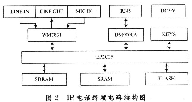 根據(jù)1P電話終端的硬件需求,為該終端配置了音頻接入口、音頻編解碼芯片WM8731;網(wǎng)絡(luò)接口芯片DM9000A;存儲(chǔ)器IC42S16400;主控制器EP2C35;直流電源9