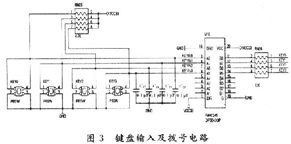 為實(shí)現(xiàn)IP電話與普通電話的通用性,該終端加入鍵盤模塊,按鍵開關(guān)KEY0~KEY9,KEY_X,KEY_Y,KEY_ON,KEY_OFF(其中,除KEY_ON和KEY_OFF是鎖閉式按鍵外,其余均為非鎖閉式按鍵)采用行列掃描式接法,加入了74HC245總線收發(fā)器作為緩沖器,電路如圖3所示(由于按鍵過(guò)多,圖中僅給出KEY0~KEY3電路)。