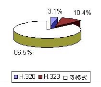 如圖5所示,目前僅僅存在少量單一H.320產(chǎn)品,雙模式產(chǎn)品在市場中占據(jù)著主導(dǎo)地位,單一的H.323模式主要由桌面會(huì)議系統(tǒng)占據(jù),市場份額穩(wěn)步增長。