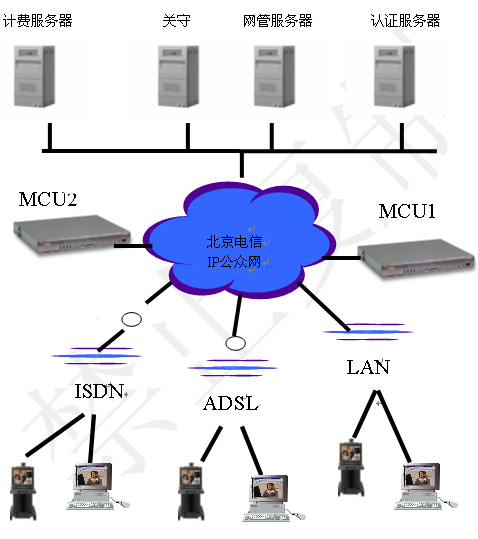 H.323協(xié)議的視訊平臺包括兩個層面:視訊交換網(wǎng)絡(luò)和運(yùn)營支撐網(wǎng)絡(luò)。視訊交換網(wǎng)絡(luò)包括MCU、Gatekeeper、Gateway、終端等。運(yùn)營支撐網(wǎng)絡(luò)包括網(wǎng)絡(luò)管理系統(tǒng)、認(rèn)證計費(fèi)系統(tǒng)、資源管理系統(tǒng)、會議控制系統(tǒng)、用戶管理系統(tǒng)、客戶服務(wù)系統(tǒng)等。