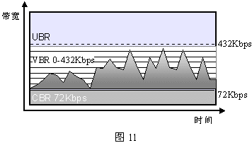 - 可變比特速率(VBR:Variable Bit Rate):允許隨時(shí)可變的帶寬,但必須指定峰值帶寬、最大突發(fā)數(shù)據(jù)長度和必須維持的最低速率。
