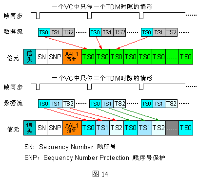 在同一個(gè)虛通道(VC)中,AAL1還支持一個(gè)或多個(gè)DS0(64Kbps)。當(dāng)虛通道中只有一個(gè)DS0話音時(shí),可以使用無結(jié)構(gòu)數(shù)據(jù)格式(UDF:Unstructured Data Format)傳送,這是一種面向比特的技術(shù);當(dāng)有多個(gè)DS0同時(shí)傳送時(shí),必須使用結(jié)構(gòu)化數(shù)據(jù)格式(SDF:Structured Data Format),此時(shí)各DS0數(shù)據(jù)流按字節(jié)依次傳送,即是面向字節(jié)的。這兩種格式的區(qū)別如下圖13所示。其中AAL1指針用于指示多DS0時(shí),第一個(gè)DS0字節(jié)位置,以便定時(shí)。利用AAL1可以實(shí)現(xiàn)ATM對STM(TDM)信號的傳送,見圖14。
