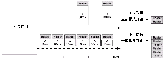 在一個(gè)減少發(fā)話方和受話方間音頻反應(yīng)時(shí)間的努力中,VoIP網(wǎng)關(guān)通常會(huì)配置成發(fā)送較小的語(yǔ)音數(shù)據(jù)載荷。雖然這樣做通?梢詼p少聽得見的傳輸延遲,但同時(shí)也增加了一個(gè)給定語(yǔ)音數(shù)據(jù)流需要傳遞的包的數(shù)量。因?yàn)椴还芏嘈〉囊纛l載荷都需要一個(gè)固定大小的包報(bào)頭,網(wǎng)上需要傳遞的數(shù)據(jù)量越大這個(gè)效果越明顯──跟隨的是網(wǎng)絡(luò)包和數(shù)據(jù)流量的相應(yīng)增長(zhǎng)。圖1說(shuō)明了用于傳輸包報(bào)頭的帶寬會(huì)隨著包載荷大小的縮小而增大。