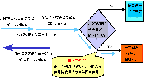 然而,如果判斷過程是根據(jù)功率電平的相對(duì)差異來進(jìn)行的(而不是絕對(duì)差異),測量結(jié)果將更為準(zhǔn)確。通過在靜音期間測量兩個(gè)傳輸方向上的線路功率電平,就能得知相對(duì)的功率電平差異。使用在靜音期間獲得的信息,在分類信號(hào)前(即決定信號(hào)是聲學(xué)回聲還是有效語音),對(duì)呼叫兩端的功率電平差異進(jìn)行修正,就能更加準(zhǔn)確地了解相對(duì)信號(hào)強(qiáng)度。該方法稱為智能語音檢測,它能顯著降?quot;錯(cuò)誤類型1"出現(xiàn)的可能性,如圖9所示。注意,在分析該方法時(shí),請(qǐng)比對(duì)圖5和圖9。