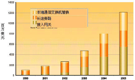隨著因特網(wǎng)業(yè)務(wù)的普及,與傳統(tǒng)電信業(yè)務(wù)供應(yīng)商形成競爭、替代局面的新業(yè)務(wù)供應(yīng)商看到了重大的機會:利用通過包網(wǎng)絡(luò)傳送話音(VoP)業(yè)務(wù)取代分離的話音/數(shù)據(jù)網(wǎng)業(yè)務(wù)。VoP技術(shù)最初主要用于長途旁路。在過去的兩年里,VoP網(wǎng)絡(luò)的發(fā)展勢頭明顯加快,通過寬帶網(wǎng)傳送話音的接入網(wǎng)關(guān)正在推廣,利用VoP本地網(wǎng)關(guān)代替?zhèn)鹘y(tǒng)中心局交換機的機會也已出現(xiàn)。圖1用圖例說明了VoP在交換機替換、長途旁路和接入網(wǎng)關(guān)方面市場的分塊大小以及對末來的預(yù)測。