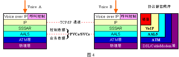 除了上面的LES外,還可以通過AAL5進行話音傳送。下圖4為其協(xié)議模型。實質(zhì)上這是通過兩次映射完成的:首先進行的是VoIP技術(shù),之后把這些語聲IP包通過IPoATM(LANE)傳送?雌饋硭坪踹^于羅嗦,但這樣做的目的是充分利用VoIP技術(shù)的靈活性和AAL5的優(yōu)點(開銷小、糾錯強,支持多種業(yè)務(wù)速率/變速率),也即,它必須建立在ATM網(wǎng)絡(luò)的高可靠性和VoIP的充分成熟基礎(chǔ)之上;就目前的技術(shù)發(fā)展而言,這兩個條件都已具備了。圖4中的右邊給出了基于AAL5的典型VoATM應(yīng)用模型。