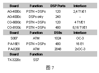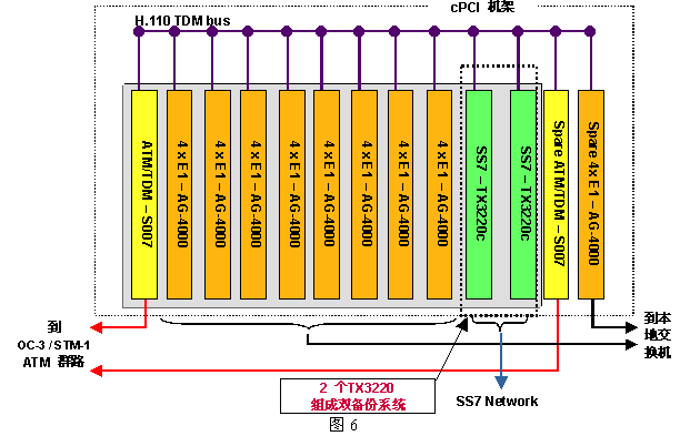 為具體起見,圖6給出一個960話音端口的應(yīng)用方案,其中用到了三種NMS公司的設(shè)備:AG-4000c、S007和TX-3220c,圖中未列出用來運行應(yīng)用程序的CPU板(AG4000系列板卡不含CPU,而AG600eC包含了CPU)。