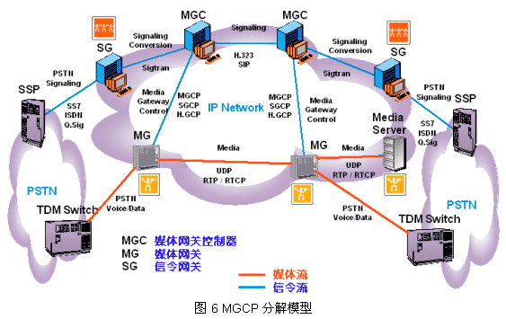 為了進(jìn)一步說明,圖6給出了MGCP協(xié)議模型的另一種表示:概念分解模型(請(qǐng)對(duì)照圖4、圖5)。下面介紹MGCP協(xié)議模型中最重要的協(xié)議:MGCP和SIP。