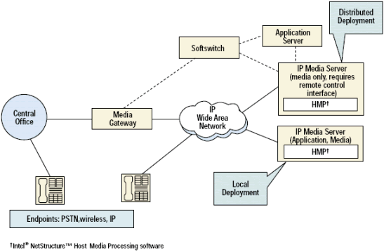 一個(gè)IP媒體服務(wù)器是在網(wǎng)絡(luò)中的終結(jié)IP連接的節(jié)點(diǎn). 根據(jù)客戶環(huán)境的不同(服務(wù)提供商或企業(yè)), IP媒體服務(wù)器可以用很多方法來(lái)實(shí)現(xiàn). 下面的圖介紹了典型的實(shí)現(xiàn)環(huán)境.