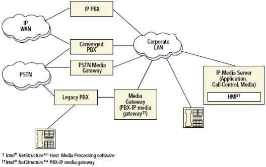 盡管許多企業(yè)有PBX連接到電路交換網(wǎng)絡(luò), 新型的PBX在不斷發(fā)展: 融合PBX可以連接到電路交換和包交換網(wǎng)絡(luò)中, IP PBX可以只連接包交換網(wǎng)絡(luò). 在一個(gè)企業(yè)里, 傳統(tǒng)的PBX使用模擬或數(shù)字接口連接到傳統(tǒng)的座席, 或者通過(guò)網(wǎng)關(guān)例如Dialogic Netstructure PBX-IP媒體網(wǎng)關(guān)連接到公司的內(nèi)部網(wǎng). 融合PBX連接到傳統(tǒng)座席和內(nèi)部網(wǎng), IP PBX只連接到內(nèi)部網(wǎng). IP座席和IP媒體服務(wù)器連接到內(nèi)部網(wǎng). 公司內(nèi)部網(wǎng)可以通過(guò)PSTN-IP媒體網(wǎng)關(guān)來(lái)連接PSTNA. 企業(yè)內(nèi)不斷增加的使用VoIP技術(shù)的需求使IP媒體服務(wù)器的需求也不斷增加.