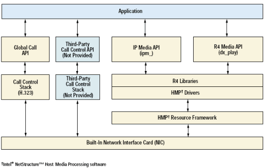 HMP 軟件是一個(gè) Dialogic® 通訊建筑模塊技術(shù). 當(dāng)安裝在一個(gè)系統(tǒng)里, 對(duì)于客戶應(yīng)用程序來(lái)說(shuō), 這個(gè)軟件就象安裝一個(gè)DM3架構(gòu)的Dialogic Dialogic板卡, 但是所有的媒體處理都是由主機(jī)處理器完成的. 為了加快客戶應(yīng)用推向市場(chǎng)的速度和把現(xiàn)有程序移植到IP, 這個(gè)軟件提供兩個(gè)API: 媒體處理用R4, 呼叫控制用GlobalCall.