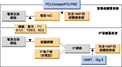 部署架構(gòu) 模塊化的下一代網(wǎng)絡(luò)將語音和數(shù)據(jù)合并在單個包基礎(chǔ)結(jié)構(gòu)中。這使目前的兩種主要架構(gòu)可用于部署媒體服務(wù);基于直通電路的網(wǎng)絡(luò)接口和基于包的IP網(wǎng)絡(luò)接口。下面的圖說明了這兩種架構(gòu)。Dialogic