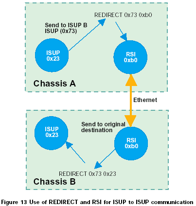 例如,一個雙ISUP系統(tǒng)應該由兩個ISUP部分組成,每個缺省module_id都為0x23。A方ISUP的設置數(shù)據(jù)表示另一個ISUP部分的module_id為0x73。因此,在A方將會有一個重定向的動作來對經過RSI發(fā)送往0x73的任何消息重新定向,在B方,應該有一個REDIRECT語句將B方RSI所接收的所有目標為0x73的消息路由到本地ISUP。標識為0x23。如圖13所示。