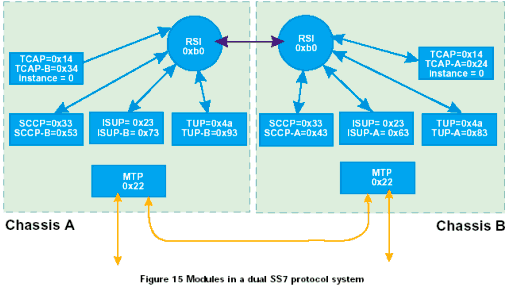下圖中描述了一個雙ISUP/TUP/SCCP/TCAP系統(tǒng)中各模塊之間的關系,以及系統(tǒng)兩部分的config.txt文件中的條目。參見圖15。