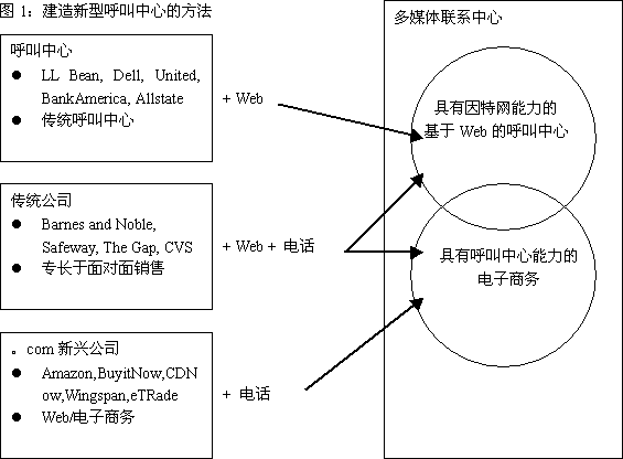 所有的公司都迫切希望找到一種途徑,使自己擁有“具有因特網(wǎng)能力的、web集成的呼叫中心”或“具有呼叫中心能力的電子商務(wù)網(wǎng)站”。圖1所示為實(shí)施方法的一個(gè)實(shí)例。但是,不管你如何稱呼它,如何達(dá)到目標(biāo),你都會(huì)面臨處理多媒體聯(lián)系的挑戰(zhàn)。多媒體聯(lián)系中心包括通過電話簽定合同和處理來自web的合同,可能是通過電子郵件,文本交談,電話呼叫,或通過web的語音呼叫。并且,大多數(shù)時(shí)候是由同一組人處理多種媒體服務(wù)。